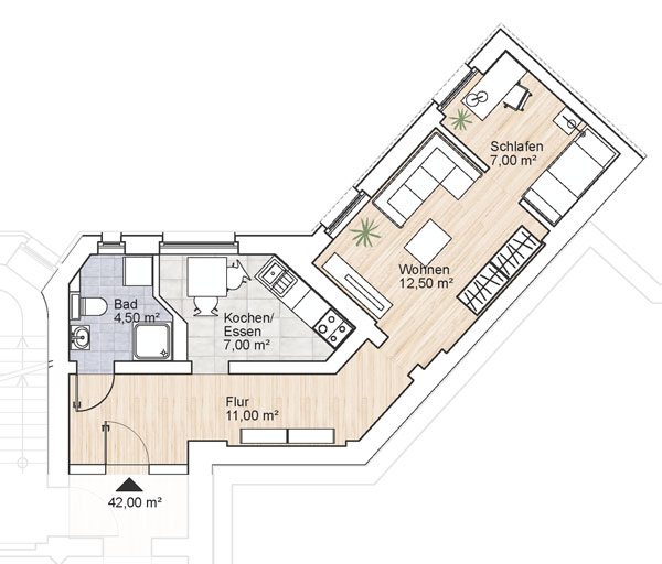 | Wohnzimmer, Schlafzimmer, Wohnküche, Flur, Bad | |