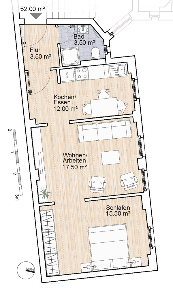 Die ruhige Lage zum Innenhof bietet eine idyllische Wohnqualität und zentrale Lage zugleich. Über den Flur sind Küche, Tageslichtbad sowie Wohnbereich erreichbar. An den Wohnbereich schließt sich der große Schlafbereich an. Die Räume sind mit hochwertigen Dielenböden ausgestattet.