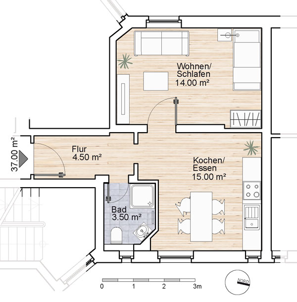 | Wohnzimmer/Wohnküche, Schlafzimmer, Bad, Flur | |