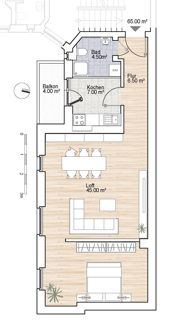| Wohnen-/Schlaf-Loft, Küche, Balkon, Bad, Flur | |